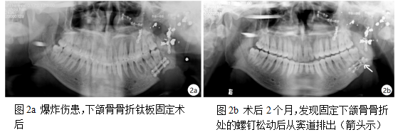 口腔頜面外傷近幾年呈逐漸上升趨勢,在頜面外傷中除可能發(fā)生骨折、骨質裸露或缺損外,其周圍軟組織也會有不同程度的水腫和損傷。尤其是爆炸傷患者,其軟組織創(chuàng)緣常有燒灼及震蕩傷,易發(fā)生局部軟組織的壞死[6]。在本組20例頜骨骨折患者中,多為粉碎性骨折,骨段的復位和固定有一定困難,且往往需要兩塊以上的鈦板固定在很狹窄的骨段上,以維持其穩(wěn)定性。加之相應部位的軟組織有不同程度的壞死和損傷,血供較差,這些患者多在骨折復位固定術1~2個月發(fā)生局部疼痛,粘膜或皮膚出現瘺道,且時常有分泌物流出(圖1)。沿竇道可探到鈦板或螺釘,本組患者中5例訴有松動螺釘從瘺道排出(圖2 )。這可能與鈦板固定區(qū)骨質不健康導致局部感染,發(fā)生排斥反應,或與螺釘所在區(qū)域骨皮質較少,螺釘固定不牢有關。當皮膚或粘膜紅腫并有瘺道?,甚至有螺釘從竇道排出,此時局部換藥或使用抗生素雖可減輕患者疼痛和不適感,但不能解決根本問題。應在病情穩(wěn)定時及時取出鈦板,并對感染的軟硬組織進行處理。