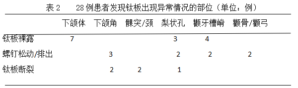 方法:對28例鈦板裸露、螺釘松動或脫落及鈦板斷裂患者的手術類型、手術時的情況,鈦板出現異常情況的時間等進行了回顧性分析與研究。