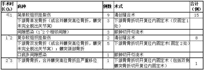 25例急診患者中,入院24 h內(nèi)手術(shù)16例,入院后24~72 h內(nèi)手術(shù)9例。實施全麻手術(shù)19例(76%),局麻手術(shù)5例。1例下頜骨骨折患者因自覺手術(shù)及麻醉風(fēng)險過大,拒絕手術(shù),安排出院。手術(shù)治療的24例患者中,手術(shù)時長≤1 h 15例,1~2 h完成8例,2~3 h完成1例(表3)。