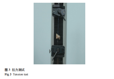 1.1.5??拉力測(cè)試? 采用寧波慈北醫(yī)療器械有限公司的拉力測(cè)試儀(Grandtry)對(duì)拉力進(jìn)行測(cè)驗(yàn)。髁突下端用鋼絲固定在下端夾板(鋼絲將髁突標(biāo)本固定),上端夾板固定錨固線,長(zhǎng)度留取5cm,并使錨固釘長(zhǎng)軸與拉力的方向垂直;儀器啟動(dòng)后,上下兩端的夾板自動(dòng)勻速(100mm/min)向相反的方向運(yùn)動(dòng),直到被測(cè)試的錨固線斷裂而自動(dòng)停止,顯示器顯示此時(shí)的拉力數(shù)據(jù)(圖3)。
