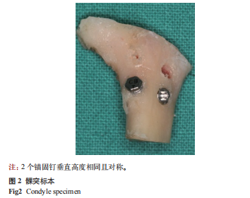 1.1.4??植入過程? 在髁突后斜面的下邊緣處分別植入傳統(tǒng)的和改良的錨固螺釘,深度10~15mm。2個(gè)錨固螺釘放置對(duì)稱,其間距>3mm(圖2)。